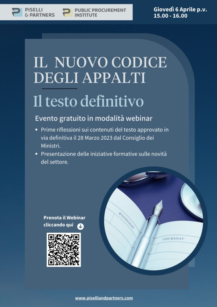 Proprio per l’estrema importanza delle modifiche introdotte e visti i ristrettissimi tempi di entrata in vigore, lo Studio Piselli & Partners, in collaborazione con PPI-Public Procurement Institute, ha organizzato un webinar gratuito il giorno 6 aprile p.v., dalle 15:00 alle 16:00, per un primo commento sui contenuti del testo approvato e per illustrare le prossime iniziative formative di approfondimento.