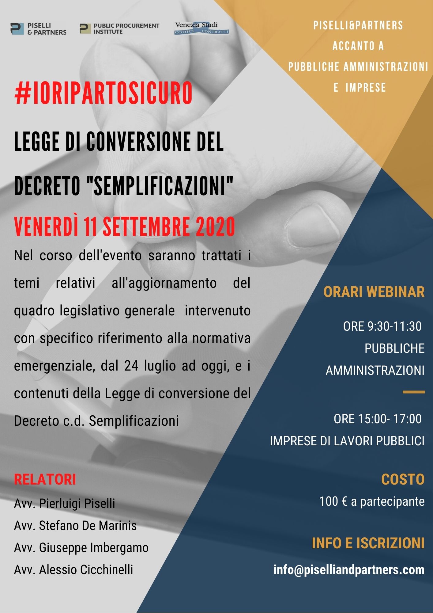 Nuovo appuntamento dell’iniziativa #IORIPARTOSICURO, dedicata all’aggiornamento di Imprese e Pubbliche Amministrazioni: PPI-Public Procurement Institute e i Professionisti dello Studio Legale Piselli&Partners proseguono l’approfondimento delle novità normative del settore appalti intervenute nel contesto post-emergenziale.