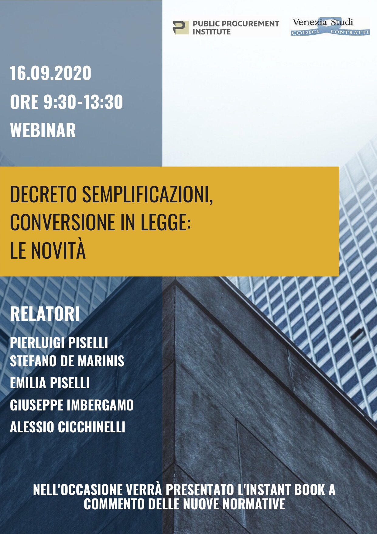 Public Procurement Institute, in collaborazione con Venezia Studi e con i Professionisti dello Studio Legale Piselli&Partners, organizza per il prossimo 16 settembre un webinar di approfondimento operativo, con lo scopo di fornire a agli operatori del settore gli strumenti giusti per orientarsi nella nuovo contesto normativo.