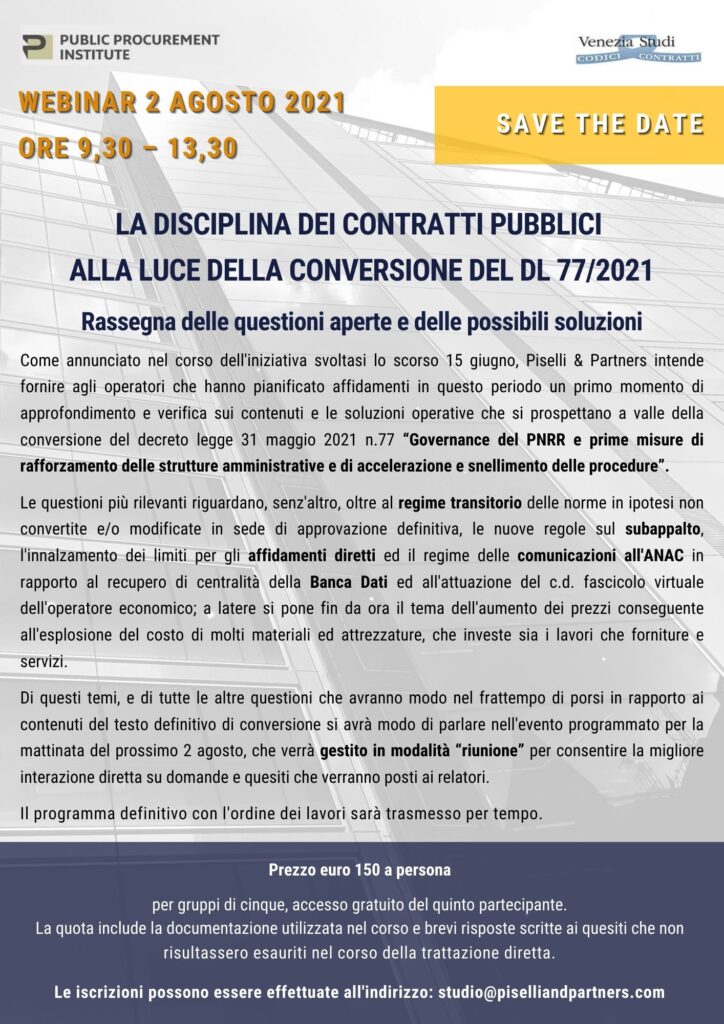 E’ previsto per lunedì 2 agosto 2021, ore 9:30 – 13:30, il webinar dal titolo “LA DISCIPLINA DEI CONTRATTI PUBBLICI, ALLA LUCE DELLA CONVERSIONE DEL DL 77/2021”, organizzato da PPI – Public procurement Institute e Venezia Studi, in collaborazione con i Professionisti dello Studio Legale Piselli&Partners.